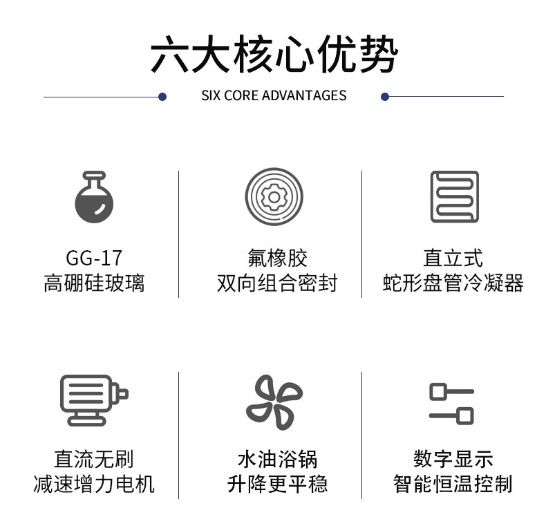 蒸發(fā)瓶恒速旋轉(zhuǎn),水浴鍋恒溫加熱,在此條件下:物料在蒸發(fā)瓶?jī)?nèi)壁形成大面積均勻薄膜快速蒸發(fā),在真空條件下可以提高蒸發(fā)效率(需連接真空裝置),溶媒蒸汽經(jīng)玻璃冷凝盤管時(shí)冷卻成液體(需連接冷卻裝置),回收于收集瓶。