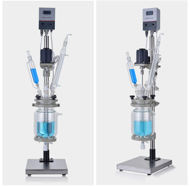 本機(jī)具有電動恒速攪拌系統(tǒng)、冷凝、滴加系統(tǒng),釜體夾層需外接加熱或制冷的循環(huán)設(shè)備。在攪拌物料的同時,通過夾層注入循環(huán)的熱溶液或冷卻液,對釜內(nèi)的物料進(jìn)行恒溫的加熱或制冷。物料進(jìn)行加熱反應(yīng)時,在真空條件下可以提高蒸發(fā)效率(需連接真空裝置),溶媒蒸汽經(jīng)玻璃冷凝盤管時冷卻成液體(需連接冷卻裝置),可回流到釜內(nèi),也可通過回流彎頭下部閥門進(jìn)行回收。反應(yīng)完畢,物料可從釜底的側(cè)出料口放出。