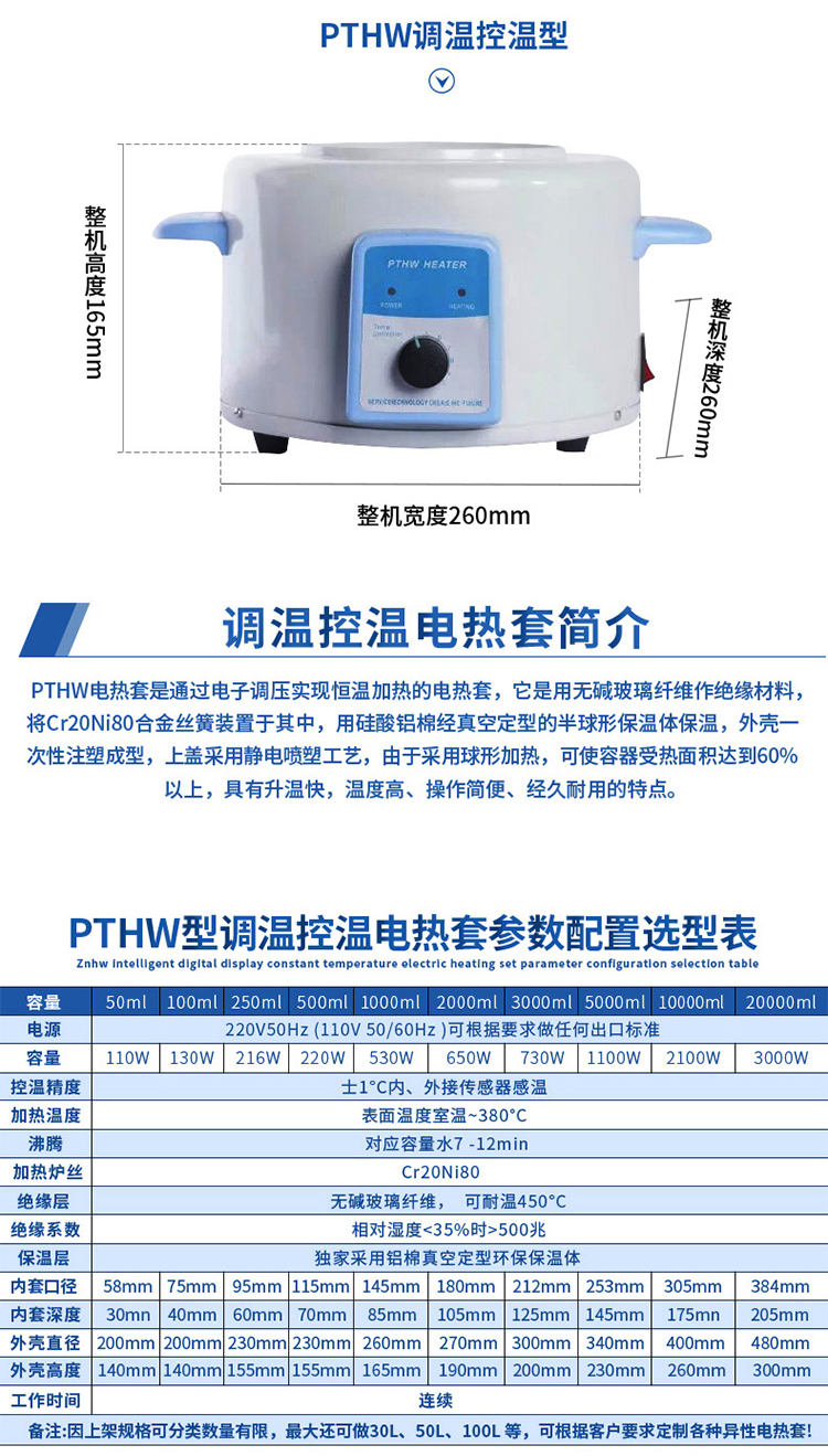PTHW型智能數(shù)顯電熱套是用無(wú)堿玻璃纖維作絕緣材料,將Cr20Ni80合金絲簧裝置于其中,用硅酸鋁棉經(jīng)真空定型的半球形保溫體保溫,外殼一次性注塑成型,上蓋采用靜電噴塑工藝,由于采用球形加熱,可使容器受熱面積達(dá)到60%以上。