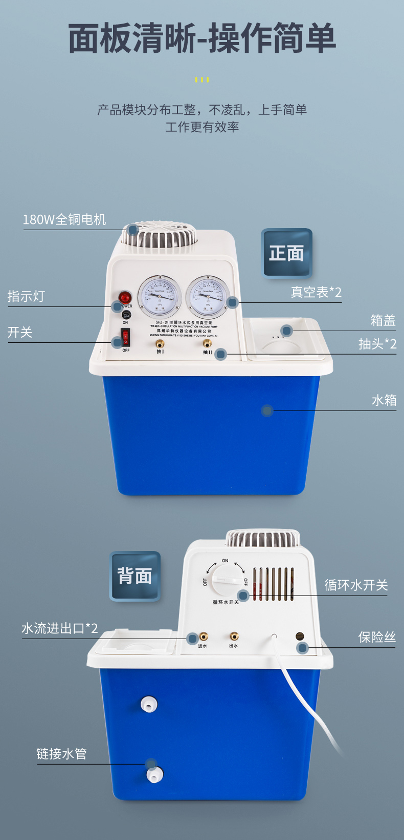該泵是在循環(huán)水多用真空泵的基礎(chǔ)上,根據(jù)實(shí)驗(yàn)室面積較小這一特點(diǎn),參照日本臺式泵,一次性成型外殼,縮小體積改進(jìn)而成,具有體積小,重量輕,外形美觀等特點(diǎn),雙表、雙頭抽氣。本機(jī)采用雙抽頭,可單獨(dú)或并聯(lián)使用裝有兩個(gè)真空表。